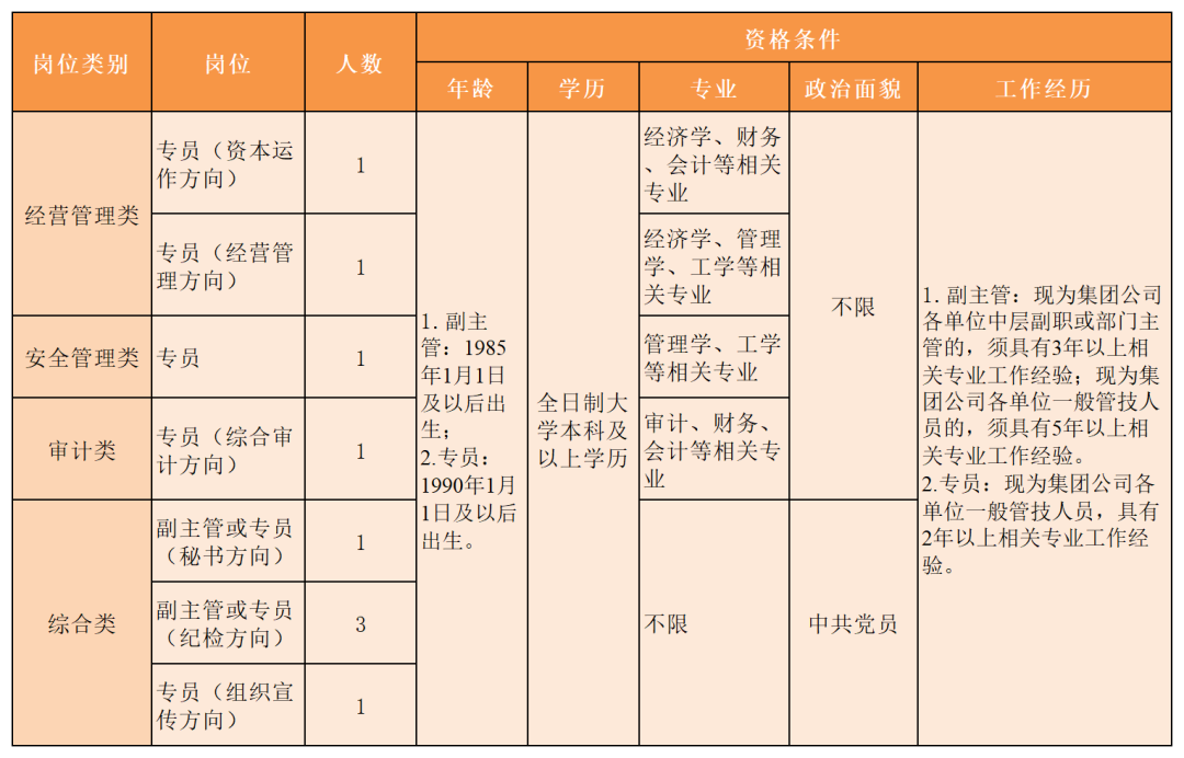 一、選聘范圍集團公司內部在冊在崗員工。二、選聘崗位及資格條件本次選聘集團公司機關部門9個副主管及以下崗位(見下表)。集團公司機關在崗工作人員參加選聘的,其資格條件按照《集團公司管理和專業(yè)技術崗位管理辦法》(淮海發(fā)〔2020〕115號)第十二條的第四、五款執(zhí)行;其他人員報名按以下資格條件執(zhí)行。應聘者除具備上述條件外,要同時具備以下條件:1.擁護中國共產黨領導,遵紀守法,誠信廉潔,職業(yè)操守和個人品德良好,無...