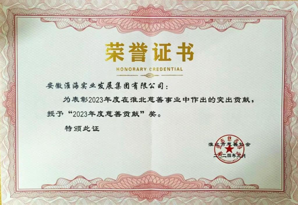 淮海實(shí)業(yè)集團(tuán)榮獲淮北市“2023年度慈善貢獻(xiàn)獎(jiǎng)”