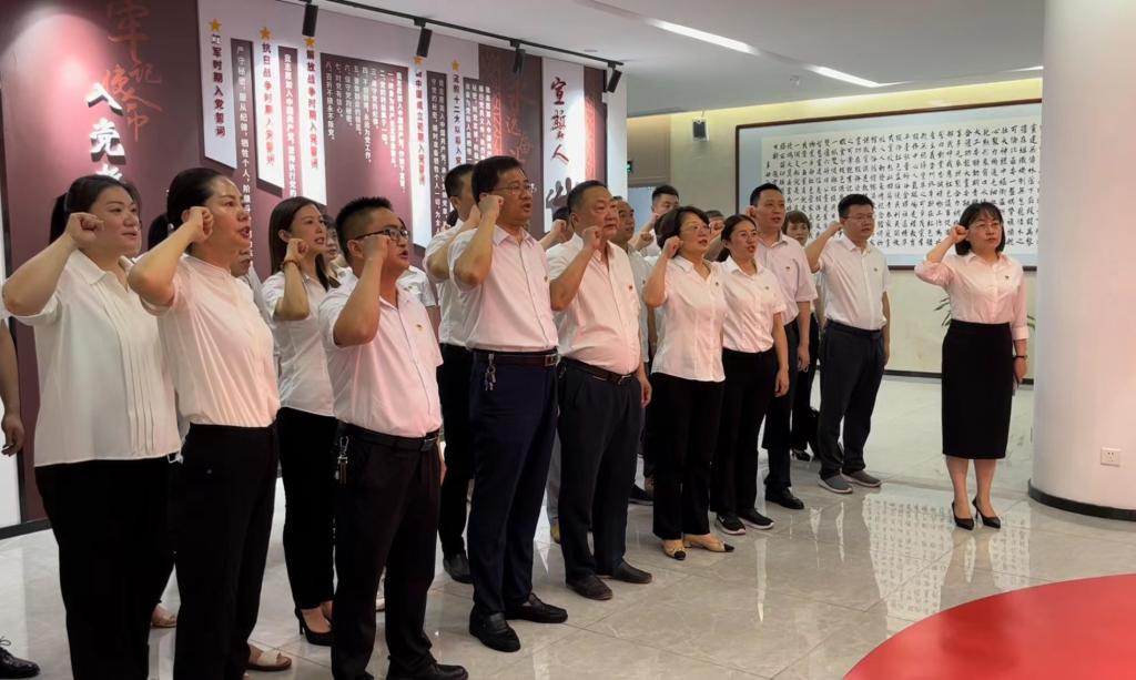 宣誓廳里,在領誓人的帶領下,全體黨員舉起右拳,用鏗鏘有力的聲音重溫入黨誓詞,錚錚誓詞激勵著在場的每一名共產黨員。