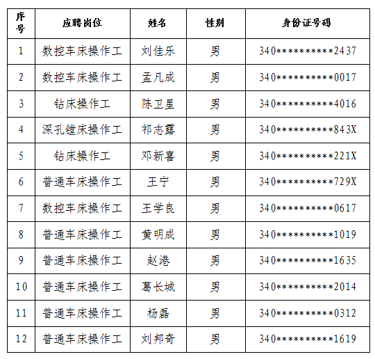 安徽省礦業(yè)機電裝備有限責(zé)任公司公開招聘面試工作已結(jié)束,按照計劃招聘招錄人數(shù)的1:1.2比例確定考察人選,根據(jù)面試情況,現(xiàn)將考察人選名單公布如下: