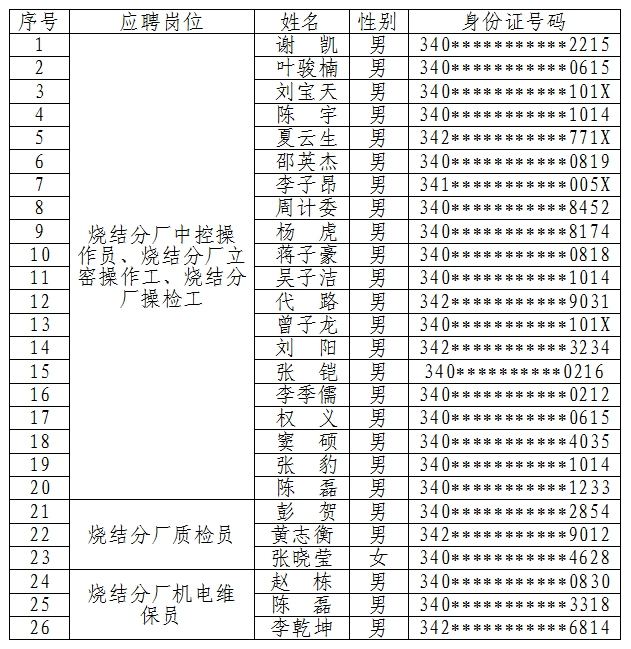 安徽淮海新材料有限責任公司技能人才招聘面試、組織考察、體檢等工作已結束,經研究,擬錄用人選如下: