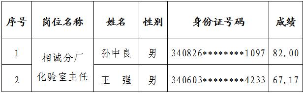 相山水泥公司相誠分廠化驗室主任招聘面試工作已結束,根據面試成績,確定2名考察人選。現將考察人選名單公告如下: