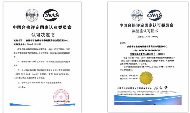 6月7日,安徽礦機檢測中心取得“中國合格評定國家認可委員會”(CNAS)實驗室認可資質,其檢測能力、測試結果可直接用于產品性能國際互認,標志企業檢測中心公信力邁上新臺階。