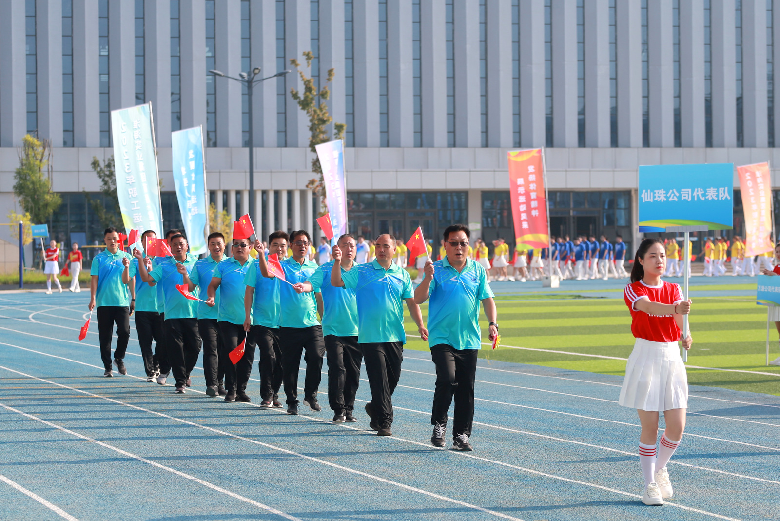7:30分,伴隨著《歡迎進行曲》音樂聲響起,運動會開幕式拉開帷幕。國旗隊率先入場,隨后集團公司旗幟隊、裁判員隊伍、運動員代表隊、演出人員隊伍邁著矯健的步伐依次入場。